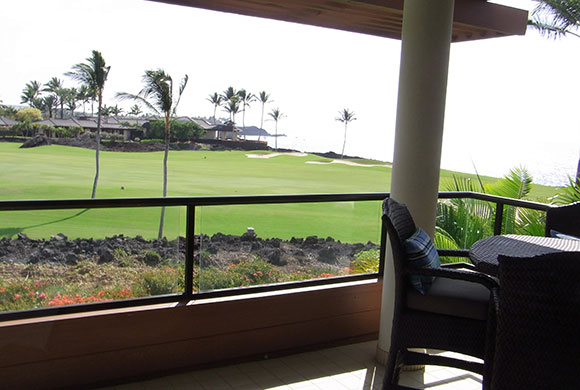 また、ラナイには、大きなテーブルとイス、寝転がることのできる簡易ベッドが2個用意され、13番ホールをプレーするゴルファーや、コースの管理作業をのんびり見ながら、ティータイムや、夕日が海に赤く染まる時間をビール片手にゆっくり過ごすことができました。特に、朝日が昇り始め、多くの南洋のカラフルな鳥たちが集まり、にぎやかに鳴き始め、朝露の掛かったフェアウエーと、バンカーの白い砂が朝日に照らされ、変化する色と芝生からのにおいと湿気を感じることができ、そこに滞在したものしか味わえない貴重なハワイを感じることができました。