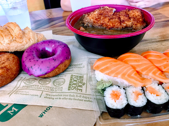 その後、初めてのホールフーズへ。高級感のあるおしゃれな店内を楽しんだあと、昼食にチキンカツカレー、サーモン寿司、ピーナッツから絞ったクリーム、ドーナツなどを購入しました。お店の外には食べるスペースがあり、フォークやスプーン、お水などが用意されています。