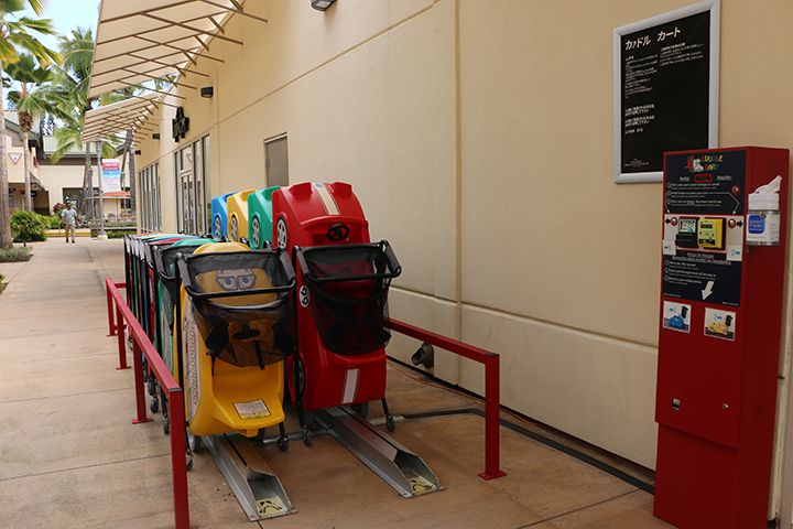 インフォメーションセンターの裏側でカァドルカートが貸し出しされています。一人乗りと二人乗りが選べて、両方とも8ドルです。支払いはクレジットカード、もしくは現金にてできます(おつりは出ません)。返却時に$1戻ってきます。※店内では通路の妨げになり使用できないので注意。