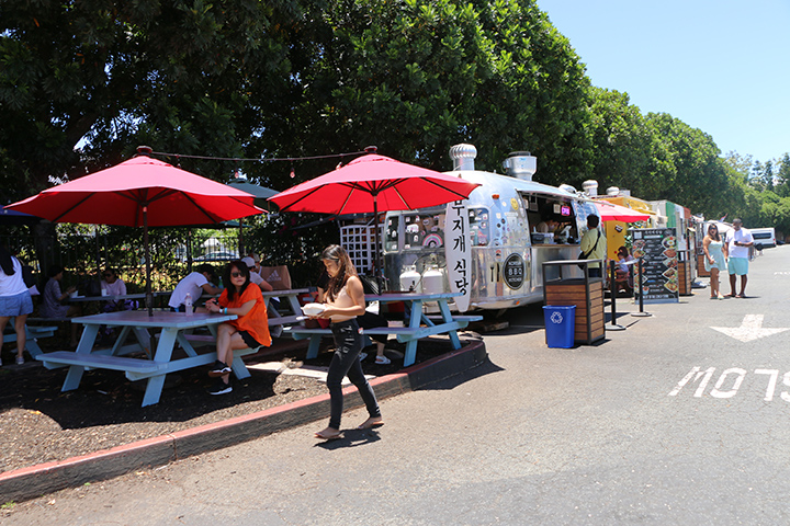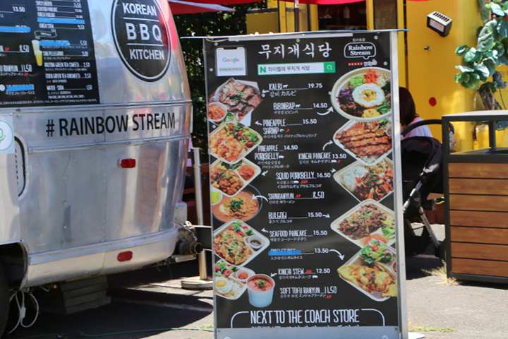 入り口から左奥の駐車場のランチワゴン・エリアが人気です。ワイケレのスタッフのおすすめで、編集部員も一番人気だという韓国料理のワゴンでランチを購入しましたが、本格的でリピートありの美味しさでした。お店の横にはテーブルも設置されて購入したプレートランチを座って食べられるようになっています。