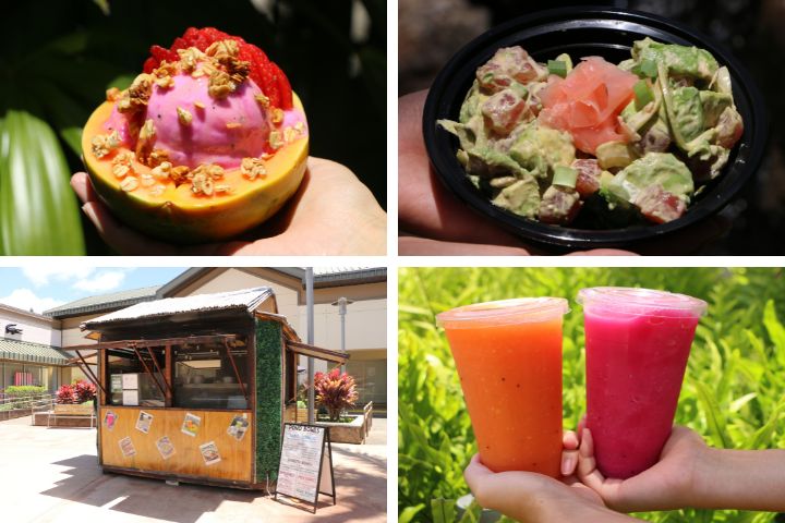 (左上から時計回りに)パパイヤボウル ドラゴンフルーツソルベット入り、新鮮なアヒを使用したアボカドポケボウル、広場にあるポノボウルのキヨスク、人口甘味料不使用のスムージー(マナマンゴーとラ・ラ・ライチ)