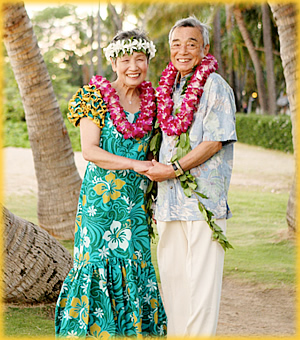 ハワイで金婚式&銀婚式、感動のメモリアル・ウエディング! (前編:金婚式編)兵庫県在住の定藤公冶さんと春子さんは、今年金婚式(結婚50周年)を迎えます。「何か記念になることを両親にプレゼントしたい」と、長女の片山文里さんがジョイフルウエディングズ・イン・ハワイ10周年記念の「メモリアル・ウエディング・プレゼント」に応募したところ、見事当選! この企画は、ハワイのビーチウェディングJ社の創業10周年を記念し、2008年に結婚50周年と25周年を迎えられるご夫婦各1組にメモリアル・ウエディングつきのハワイ旅行がプレゼントされるという嬉しいもの。プレゼントには、ハワイへの往復航空券、ワイキキパーク・ホテルへの宿泊(3泊5日)、ホノルル空港とホテル間の往復送迎、朝食3回分、専属牧師立会の挙式料、結婚証明書、フォトCD-R、ハワイアン・シンガー、リムジン、レイ2個、ハワイのガイドブック、日本語の話せるコーディネーターが含まれます。