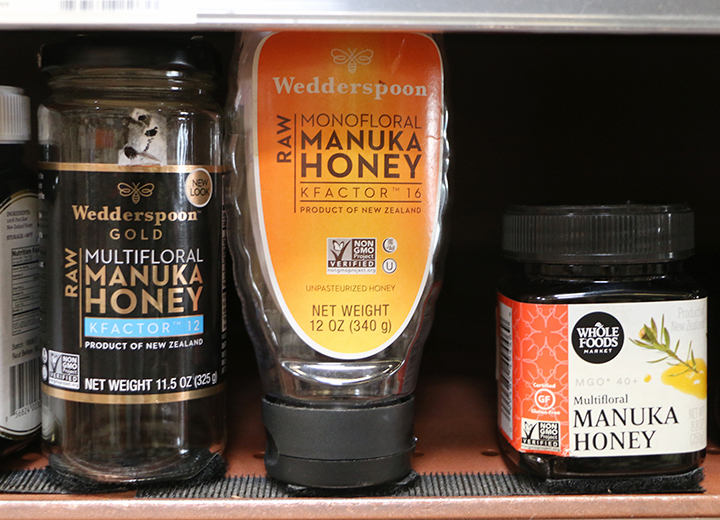 一般のはちみつより抗菌作用や抗炎作用などが高いといわれるニュージーランド産のハチミツ、マヌカ・ハニーも、ホールフーズにはいくつかのブランドが。価格はやや高めなのですが大人気商品。なお、マヌカ・ハニーはほかのハニーと売り場が異なり、1階エスカレーター上り口隣りにあるカスタマーサービスのデスクにて販売されています。