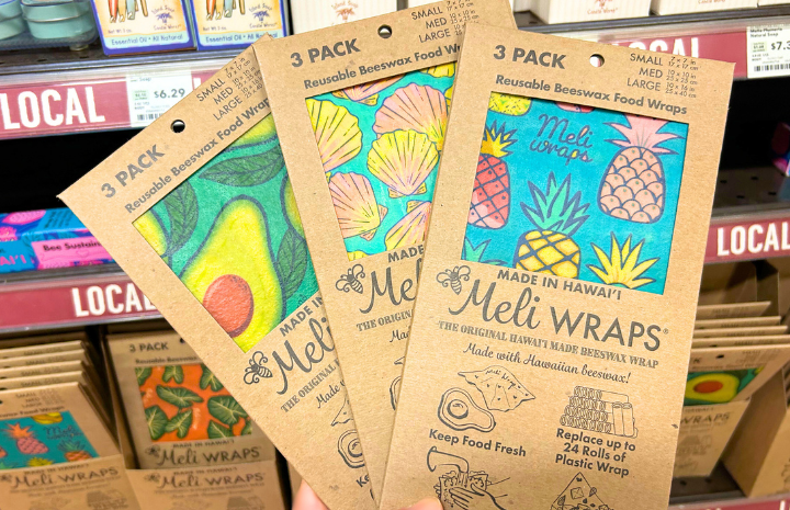 カウアイ島で作られる「メリラップ」は、食品の保存に使われるエコフレンドリーなラップです。ビーワックス(蜜蝋)、天然オイル、樹脂を作った再利用可能なラップで、プラスチックのラップに替わるエコなアイテムとして支持されています。包むたびに笑顔になれそうなかわいい絵柄が魅力的。小中大の計3枚が入っています。繰り返し使用できますが、使用期間は約1年程。