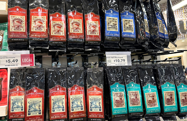 お土産におすすめなのが、「コーヒーズ・オブ・ハワイ」のミニパッケージ(57グラム入り)。モロカイ島を拠点とする同社では、モロカイコーヒーを中心にマウイやコナコーヒーなども販売しています。クイーン店では、野菜売り場の奥にあるピーナッツバター販売機の横にあります。マウイ産2つ、モロカイ産2つの4つセットで$19.79と、お得なセット商品もあります。