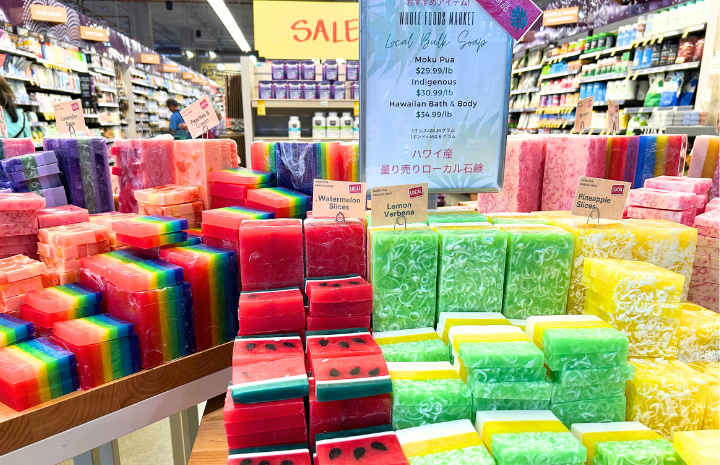 オアフ島ノースショアの工場で作られるハワイアン・バス&ボディがホールフーズ用に作ったソープもあります。様々なカラーと香りがあるので選ぶのが楽しくなりますよ!カハラ店には秤があるので、購入前に値段を確認できます。