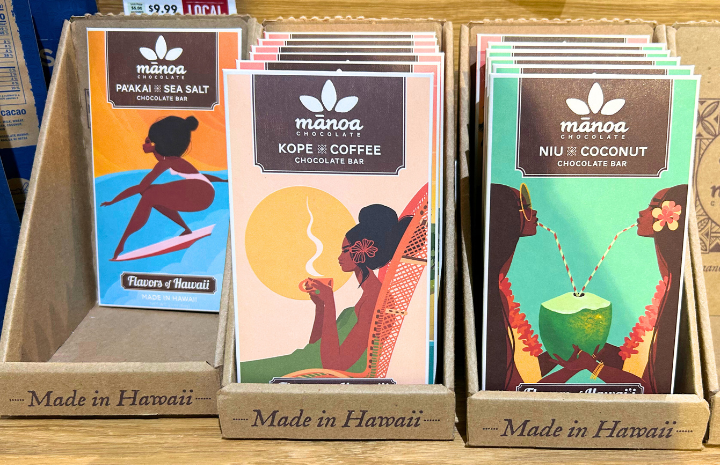 ハワイ語で「深い」「濃厚」という意味がある「マノア」のチョコレート。ハワイと世界中の上質のカカオを使用して丁寧に作られた無添加の本格派の板チョコです。オアフ島カイルアを拠点に活動しているアーティスト、シャー・ツイアソアさんが手がけた可愛いイラスト入り(上段)は、お部屋に飾れそうなお洒落なパッケージ。お土産におすすめです。