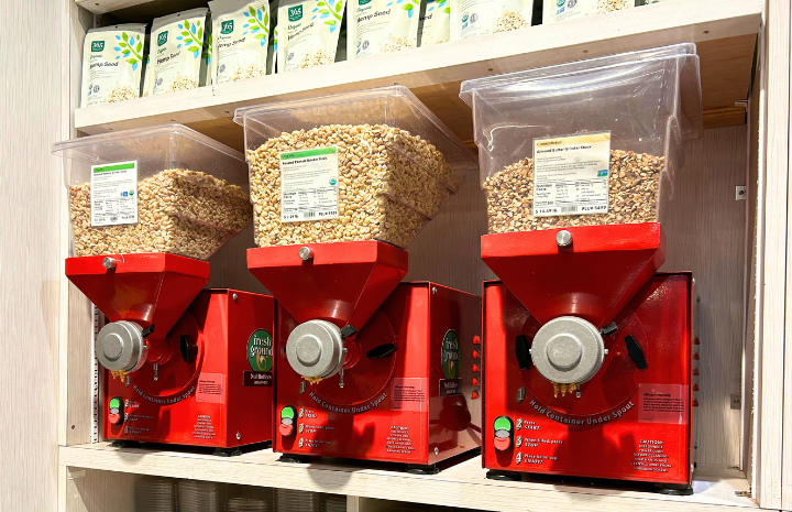 ホールフーズでは、ピーナッツバターとアモンドバターをその場で挽くことができる機械があります。左の二つがピーナッツバター(オーガニック)、右がアーモンドバター。新鮮で滑らかなバターは最高!量り売りなので滞在中に食べたい分だけ購入できます。下に置かれた専用の容器に好きなだけ入れレジへ持っていくと、重さを測ってくれるので他の購入品と一緒に支払います。日本語で使い方が記載されているのでご安心ください。