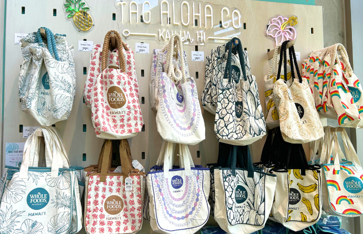 さて、ホールフーズ・マーケットに来たら絶対にゲットしたいアイテムの1つがエコバッグ。ハワイの地元ブランドとコラボしたバッグから保冷バッグまで、さまざまなデザイン、形、大きさのバッグがあります。こちらでは、その一部をご紹介! さらに詳しく知りたい方はぜひこちらの記事「ホールフーズ・マーケットのエコバッグ情報【最新版】」をご覧ください!